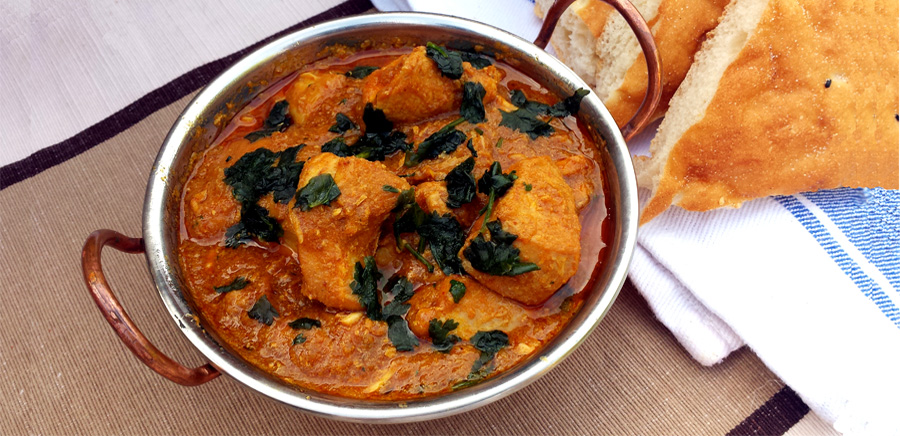 A very common curry that is made with boneless pieces of chicken, either thigh or breast. If the sauce is kept dry it will be referred to as a bhuna. Can be eaten with rice or nan.